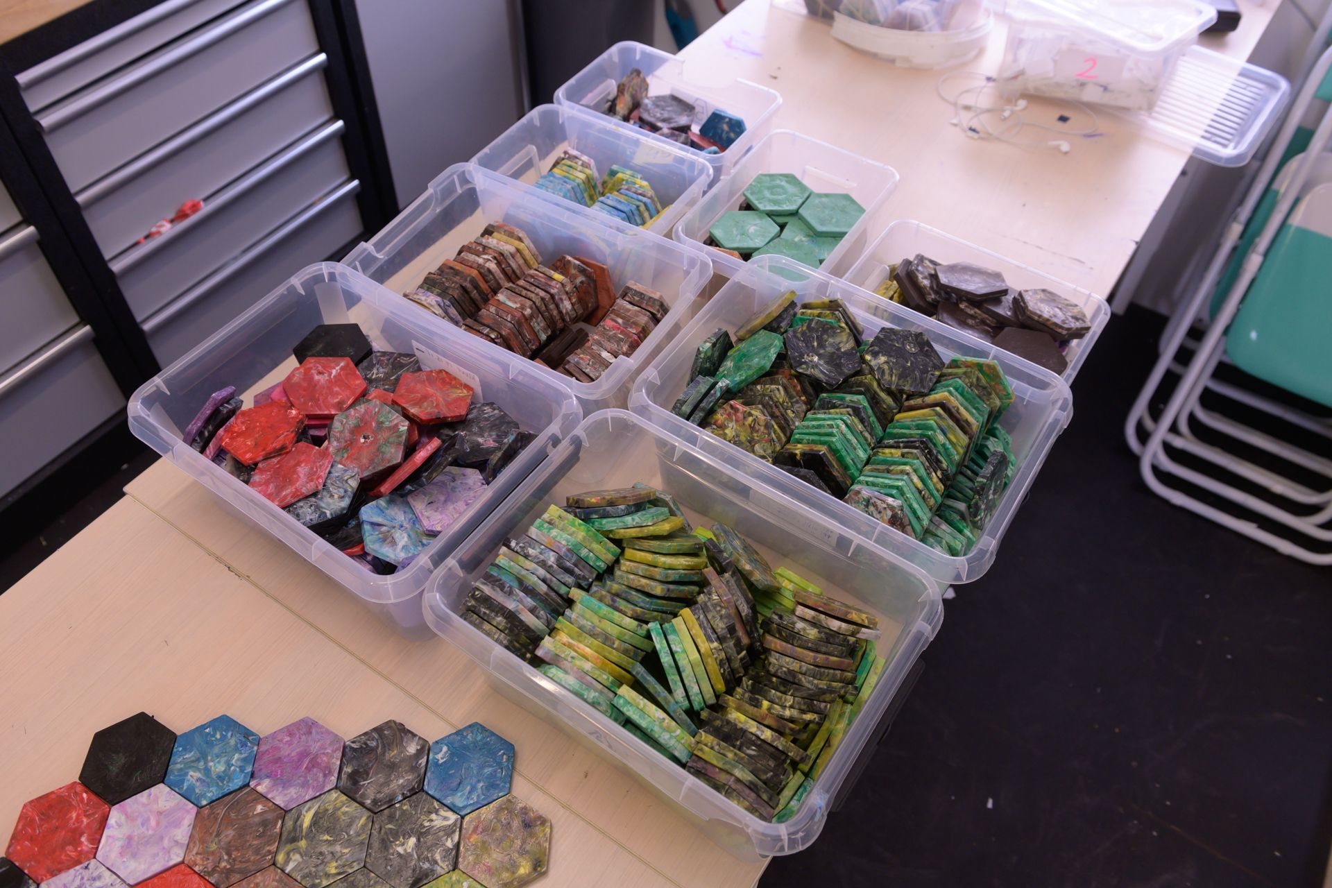 Marja van Huffel werkt vanuit de Gemeente Alkmaar als verbindingscoach. Ze heeft de werkplaats opgezet. Marja: “We zijn nu bezig met een kunstwerk “de levensboom” voor woningbouwvereniging Woonwaard. Het gesmolten plastic gaat in een mal en wordt een zeshoekige tegel.” Yasmina laat het ontwerp zien en wijst naar buiten: “Kijk, dit wordt het! Als het klaar is komt dit op dat flatgebouw daar te hangen. We hebben nog 90 tegels te gaan.”
